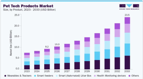这匹黑马的崛起,既踩中了全球宠物科技赛道的长期增长红利,更精准击穿了行业长期存在的结构性痛点。根据 Grand View Research2026 年 3 月初发布的最新报告,2025 年全球宠物科技产品市场规模已达 92.3 亿美元,预计到 2033 年将攀升至 235.4 亿美元,2026 至 2033 年的复合年增长率将稳定保持 12.5% 的高位。