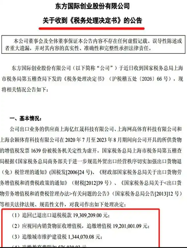 3月初,上海一家上市大卖东方国际创业股份有限公司(简称东方国际)发布公告称,因历史采购业务涉及供应商虚开发票问题,公司于近日收到国家税务总局上海市税务局第五稽查局下发的《税务处理决定书》(沪税稽五处〔2026〕66 号),公司被追缴及补缴税款、附加税费合计约4081万元。