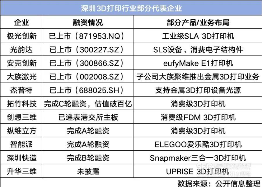 深圳 3D 打印行业代表企业信息表