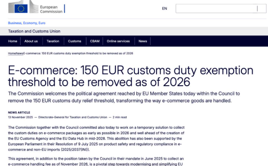 最先砸到所有卖家头上的,就是新规里板上钉钉的征税条款。按照最终敲定的执行时间表,今年 7 月 1 日起,之前能享受免税入境的 150 欧元以下低值包裹,每一类商品都要收 3 欧元的临时统一关税;更让行业捏一把汗的是,今年 11 月,欧盟大概率还要再追加一笔包裹处理费,成本压力只会只增不减。