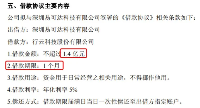 初海视野获悉,3月26日,行云科技发布公告:公司拟向深圳易可达科技有限公司借款不超过1.4亿元,借款期限仅1个月,年化利率5%。