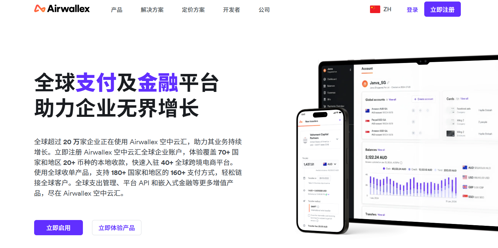 Airwallex 空中云汇定位为领先金融科技平台,专注为企业客户提供安全、合规、便捷的跨境收付款、资金管理及全球账户解决方案,依托多国金融牌照和国际安全认证,打造一站式、数字化全球金融操作体验,支持业务全球化扩展和资金流优化。平台在全球拥有 80 张金融牌照,覆盖澳大利亚、新加坡、香港、日本、英国、欧洲、美国、加拿大、中国内地、马来西亚、墨西哥、巴西等全球主要市场,是全球持牌最多的金融科技公司之一。