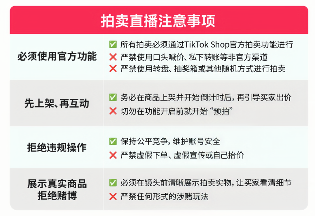 在熟悉拍卖功能的操作流程后,还需了解拍卖直播的注意事项,商家上架务必对照执行,确保直播间安全运营。