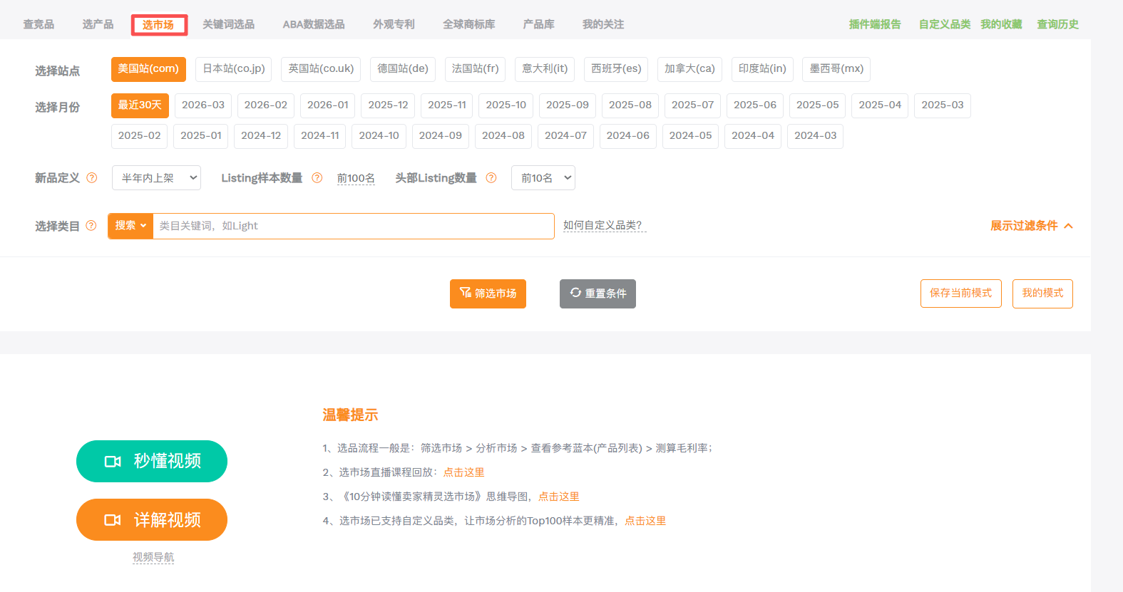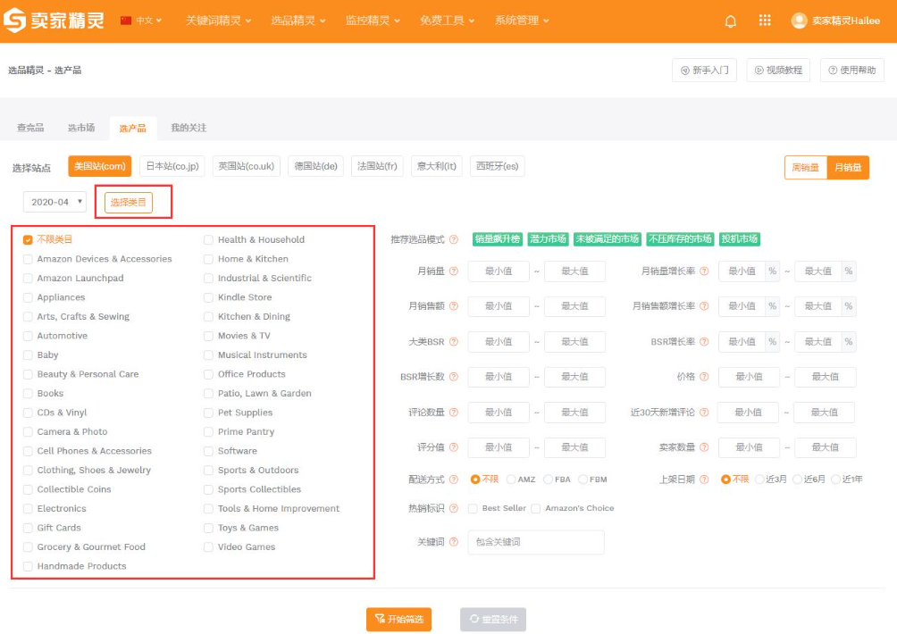 一级维度设置:核心就三个:市场、站点、类目。这三个维度定下来,你的选品大方向就不会偏。站点方面,新手优先选北美站,这个站点是亚马逊最成熟的站点,流量最大,规则最透明,新手容错率最高;类目方面,一定要优先选你自己熟悉、了解的类目,别看着哪个类目火就冲哪个,你不了解的类目,根本摸不透里面的坑;还有,新手千万别同时布局好几个类目、好几个站点,精力根本顾不过来,先把一个类目一个站点做明白,再考虑拓展。