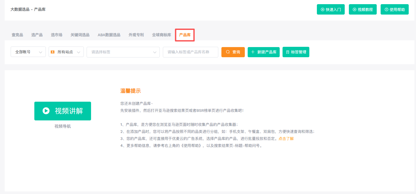 大数据选品板块,这也是卖家精灵最核心、新手用得最多的板块,里面包含了选市场、关键词选品、ABA 数据选品、选产品这四个核心功能。这个板块的核心作用,就是帮你从亚马逊上千万款产品里,筛出有潜力、能做的产品,从整个类目大盘的市场分析,到单款产品的筛选,整个选品流程都能在这个板块里完成。