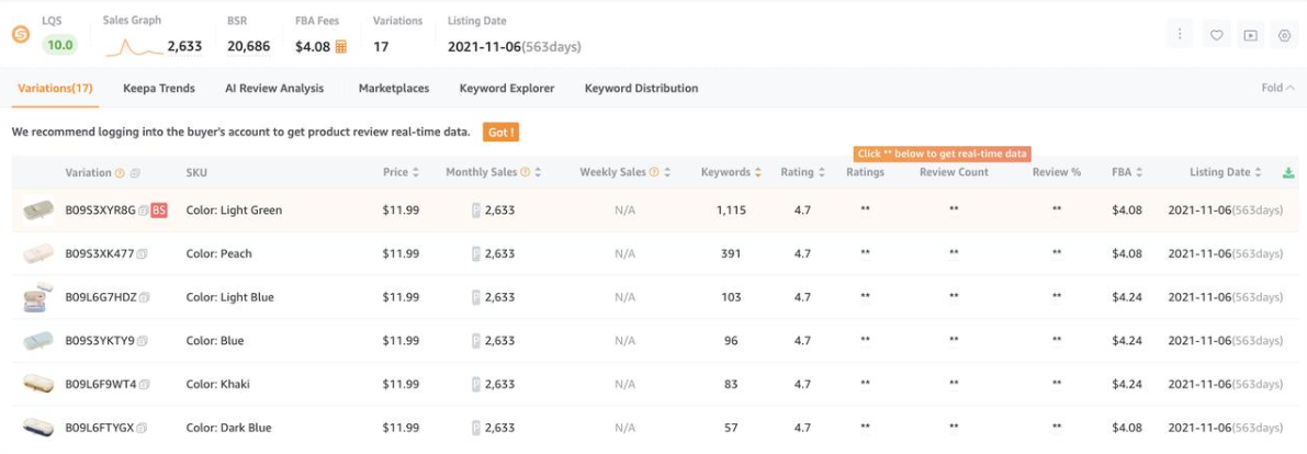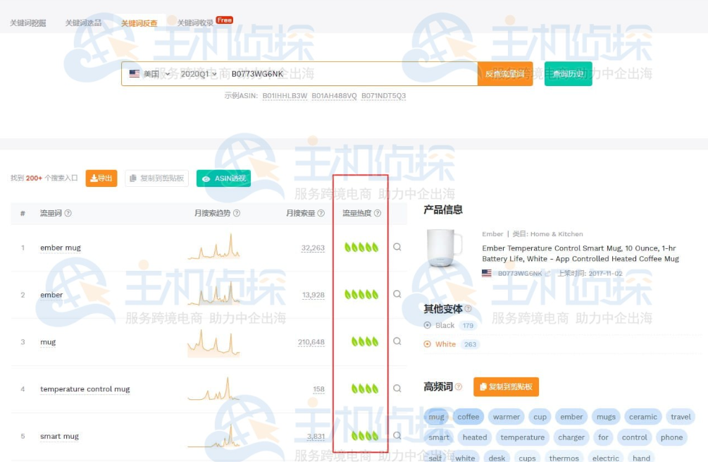 产品详情页深度数据分析:你点进任意一款产品的详情页,插件就能直接调出这款产品的完整数据,包括它近一年的历史销量趋势、价格波动情况、BSR 排名变化、评论增长趋势,还有它的全部流量词分布情况。更关键的是,你点一下插件里的「关键词反查」,就能一键查出这款产品的所有流量关键词,它的流量从哪来,哪些词是核心引流词,哪些词带来了订单,一眼就能看明白,轻轻松松摸透竞品的流量结构和运营打法。