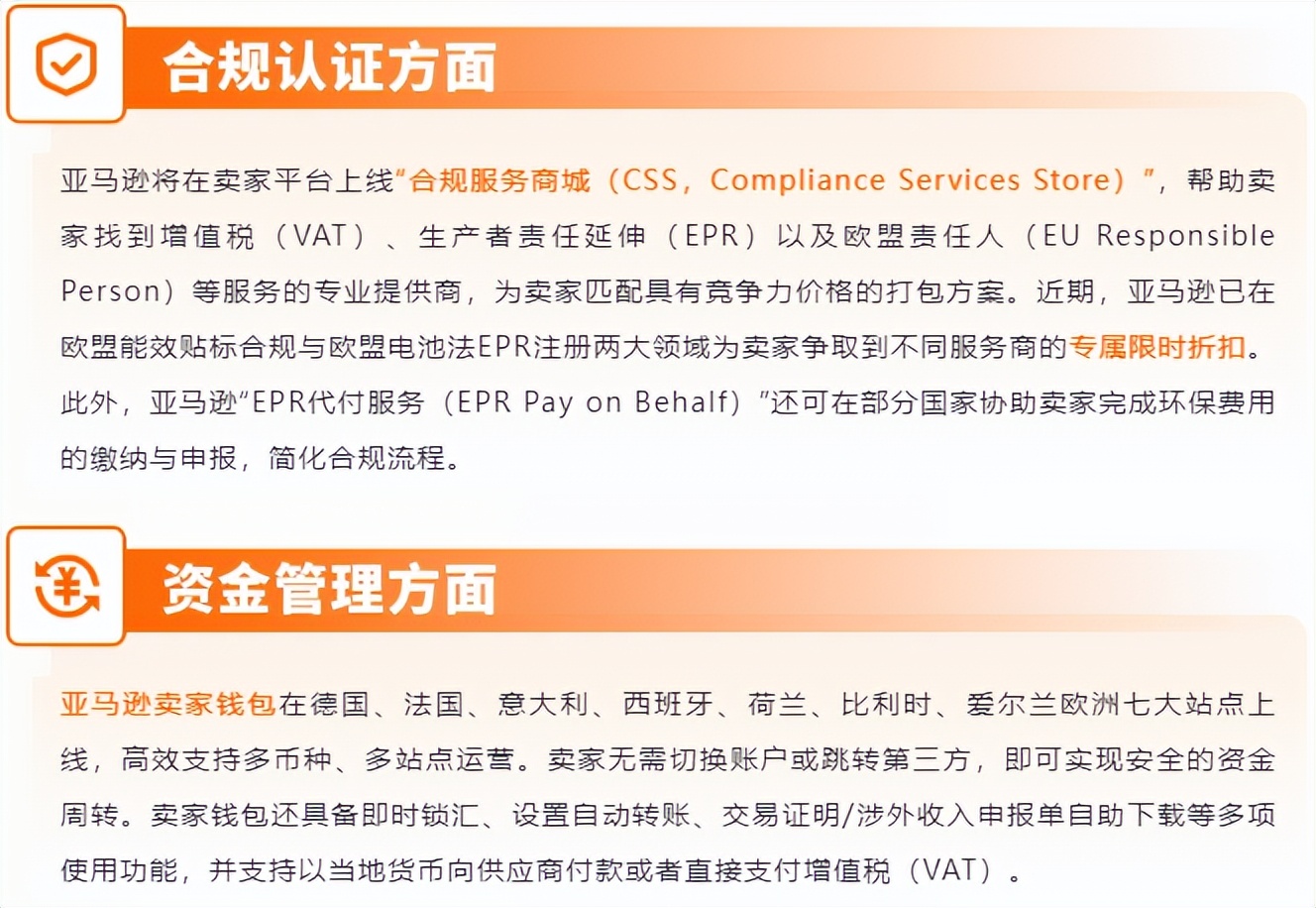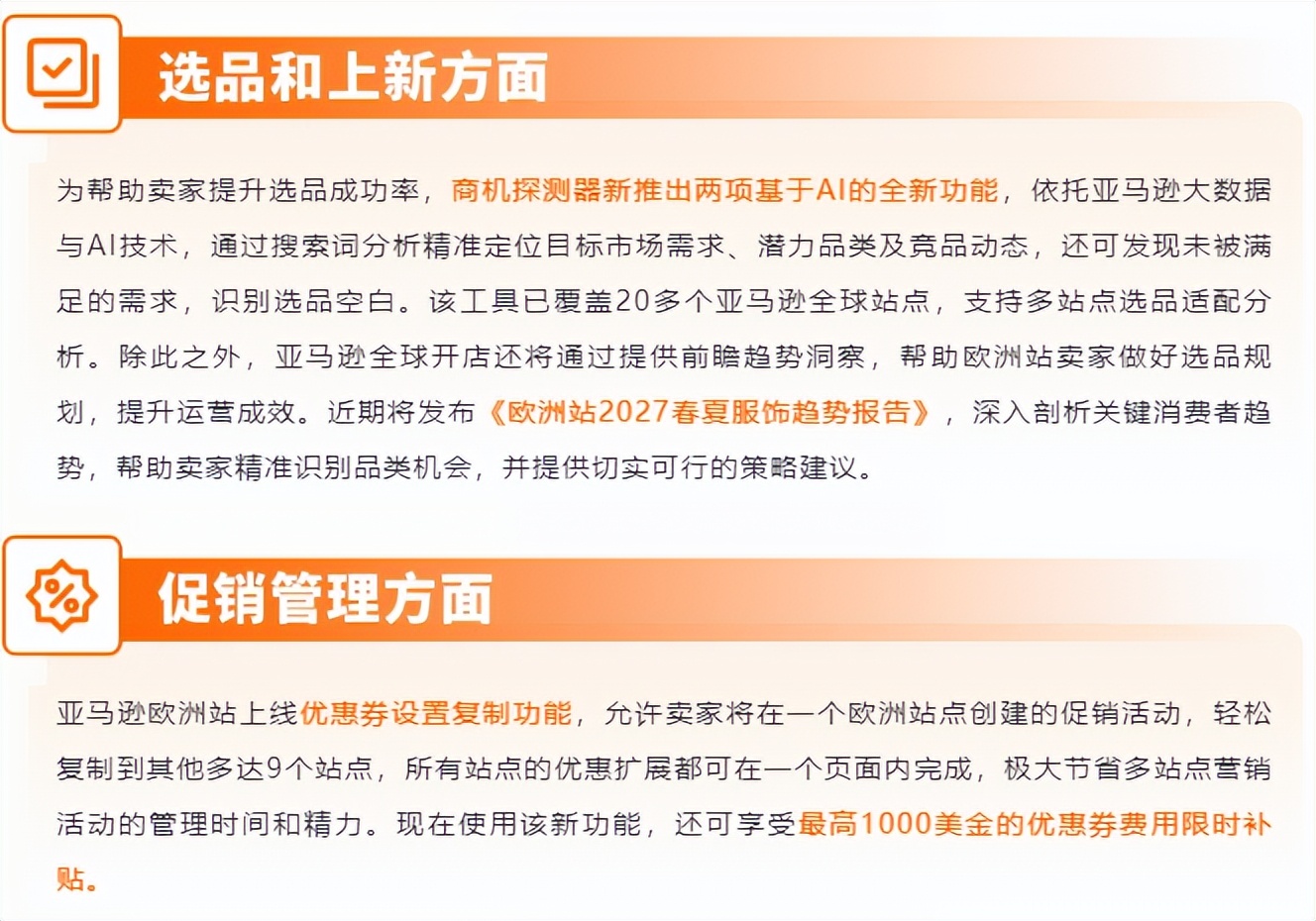 推出“重型大件商品配送计划(MSF,Multi-SellerFlex)”;优惠券设置复制功能、一站式合规支持等服务与工具同步上线。