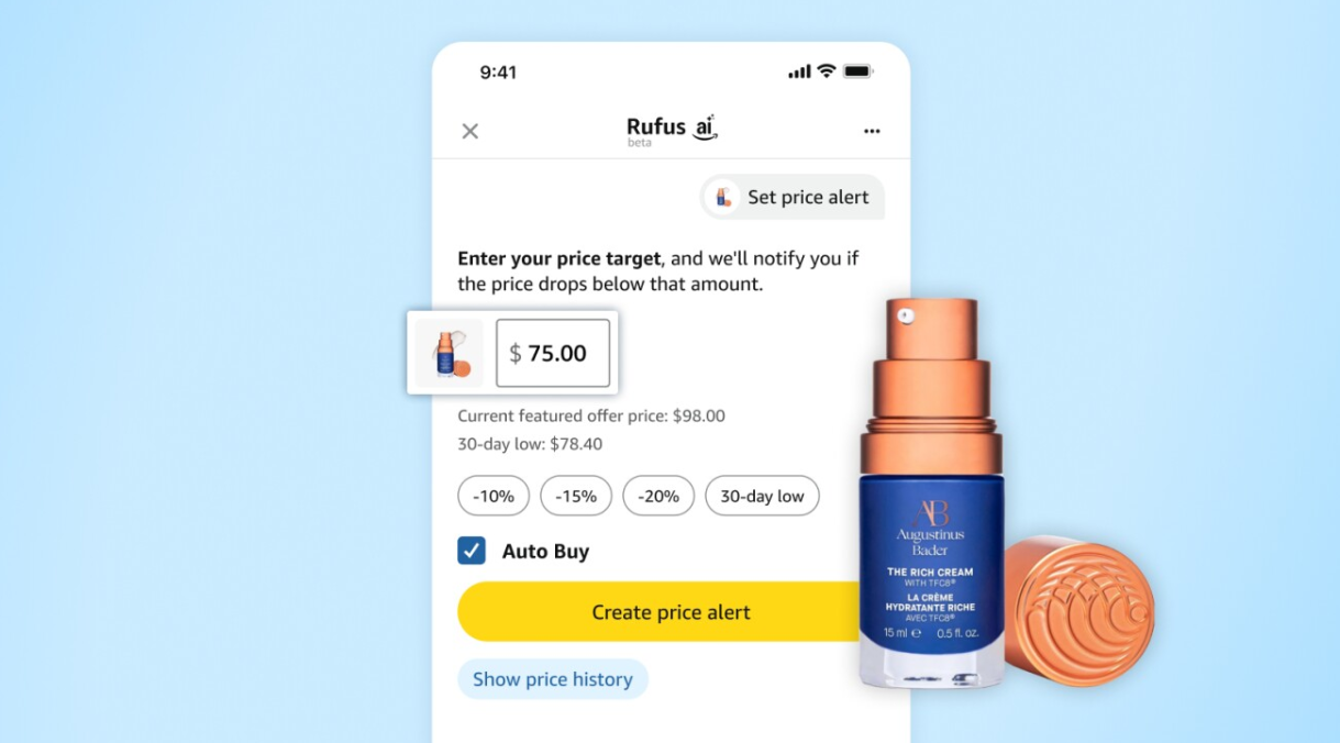 价格追踪与自动下单:Rufus 可以展示产品 30 天或 90 天的价格历史,让用户判断当前价格是否具备真实优惠;还能实现价格监控,用户设定目标价格后,Rufus 会持续监控价格波动,在降价时提醒用户下单,甚至在达到用户设定条件时自动完成购买;