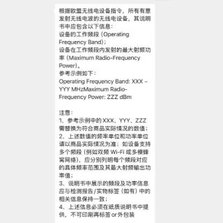 其说明书中应包无线电设备工作频段及最大射频功率,电子说明书须覆盖24种语言,纸质版至少8种。