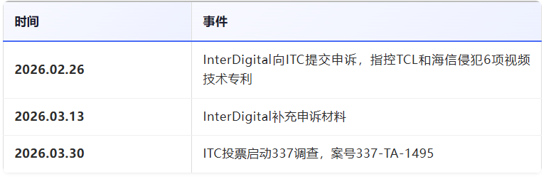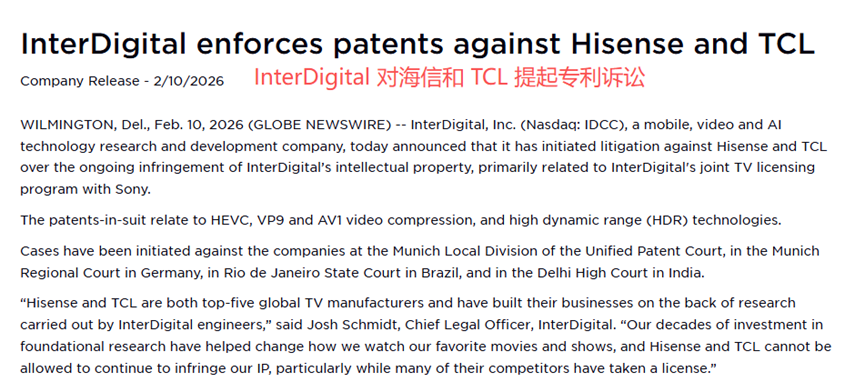 今年2月,美国专利运营企业InterDigital向美国ITC提交申请,指控TCL旗下10家、海信旗下3家关联企业的智能电视、显示器及相关核心组件,侵犯其6项视频技术专利,同时申请发布有限排除令与禁止令。
