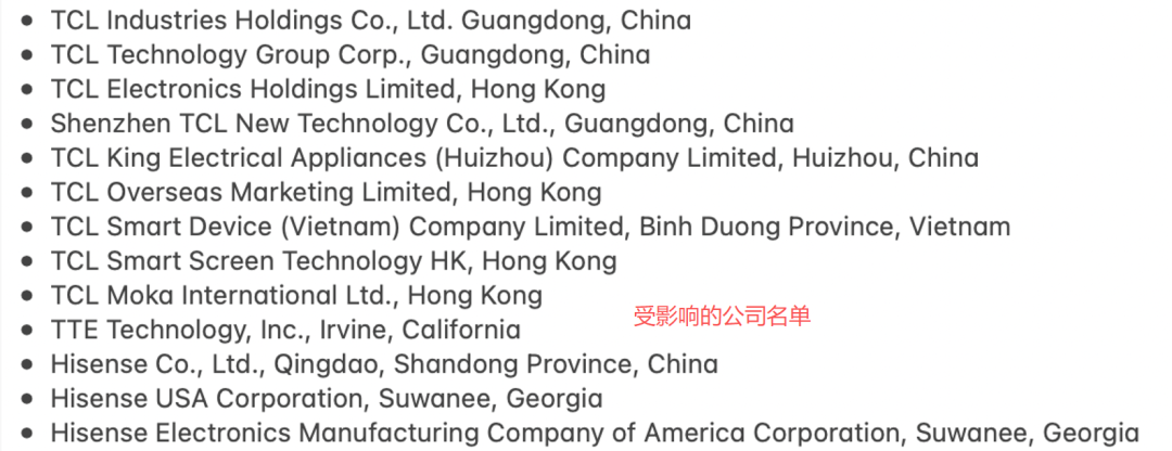 3月底,美国ITC以“侵犯了视频技术专利”为由,对TCL和海信旗下两家中国家电巨头共计13家公司发起337调查;