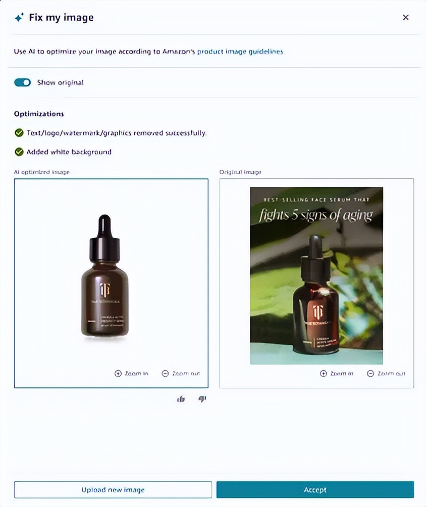 除了文字内容,视觉呈现和合规性同样影响Listing效果。对此,亚马逊Gen AI也提供了实用帮助:不少Listing因图片含文字、Logo、水印或缺少纯白背景被屏蔽。Gen AI能自动移除这些不合规元素,添加纯白背景,确保主图符合亚马逊要求,让消费者更清晰地评估商品,提升购买意愿。