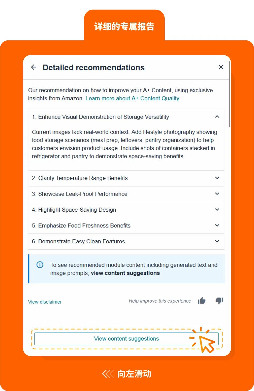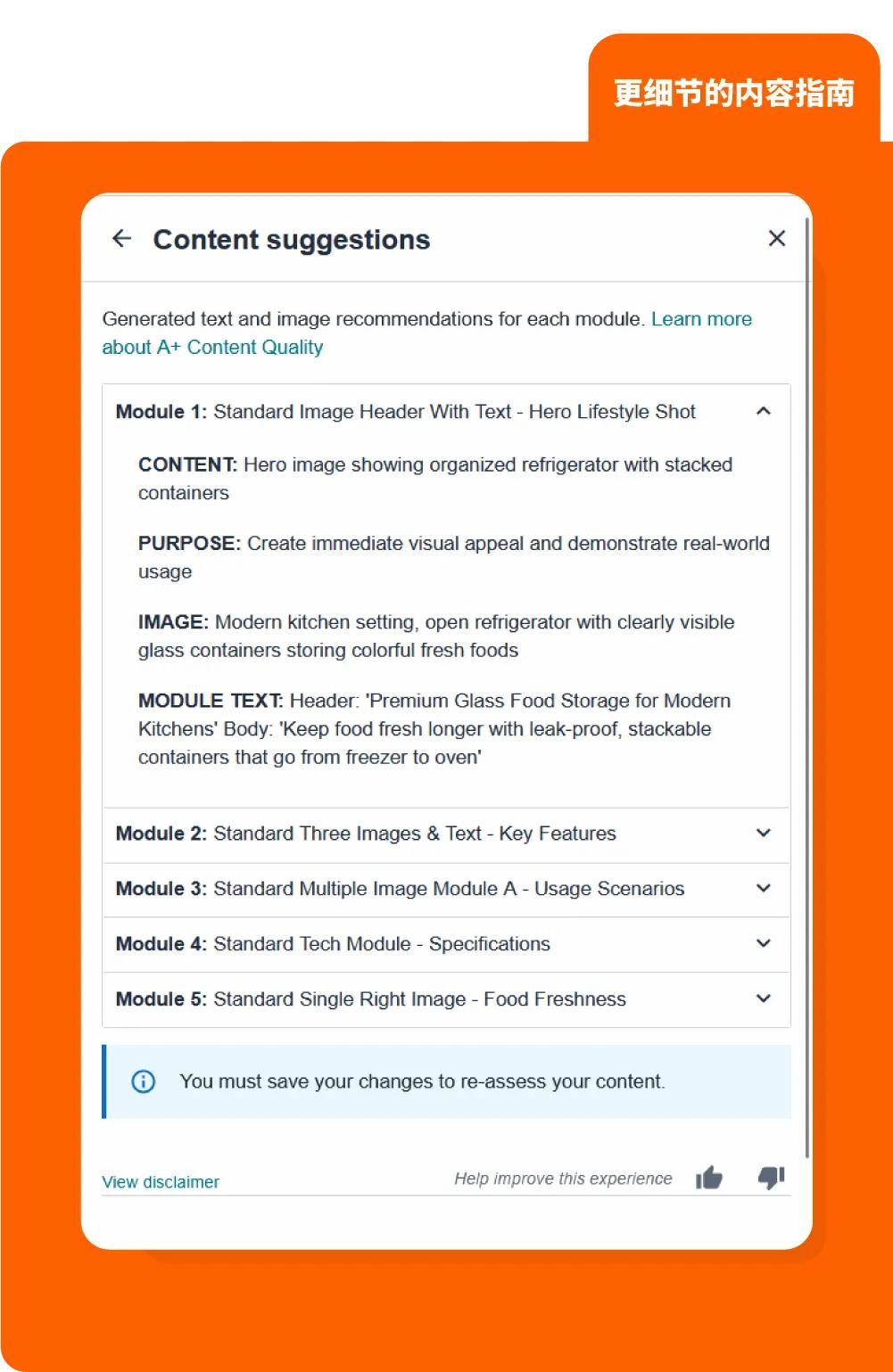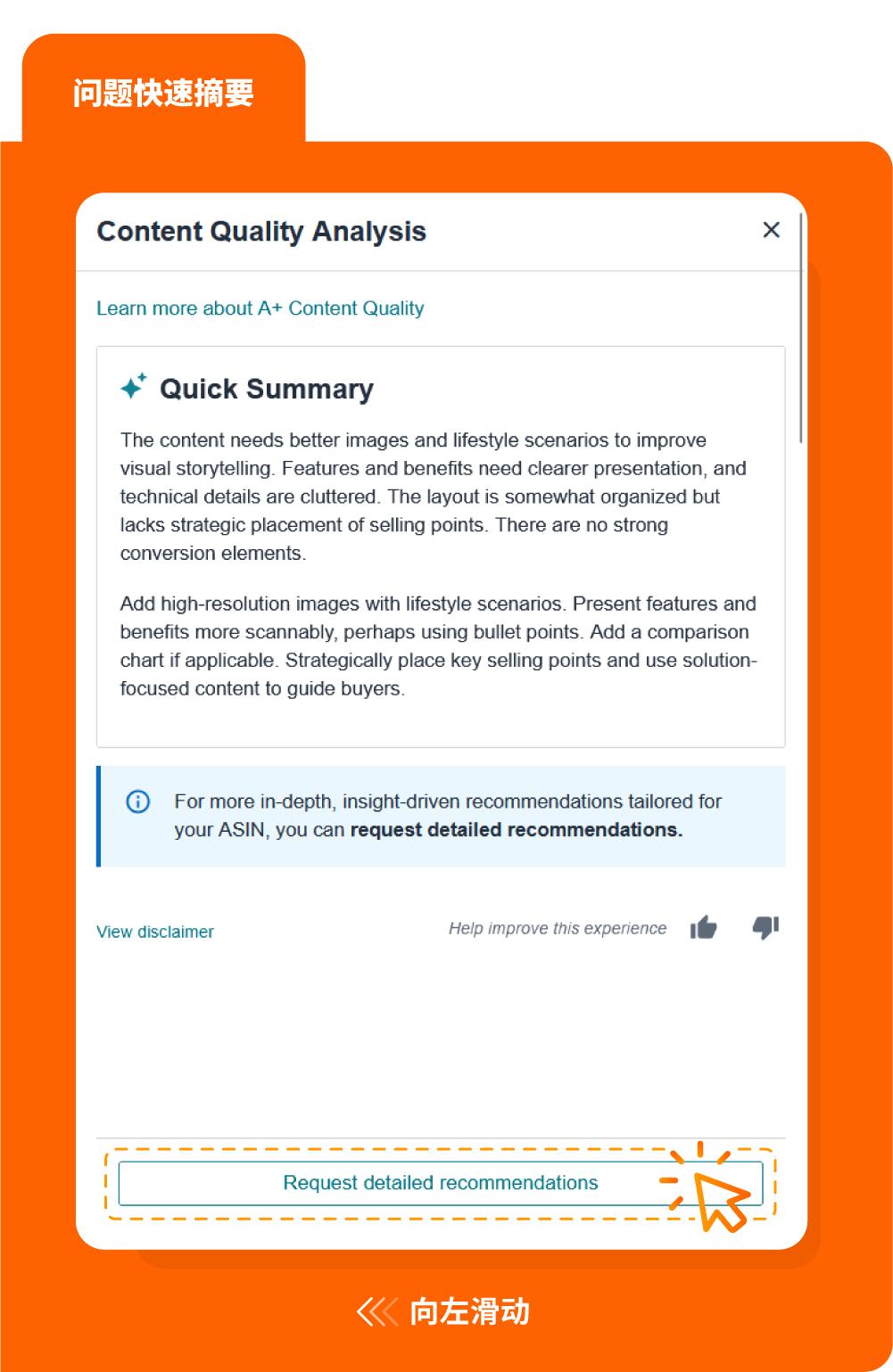 它通过AI模型自动评估你的A+页面内容质量,并给出可直接使用的文案优化建议,以及可以作为提示词的图片建议,帮你快速落地优化。