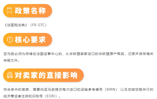 为了帮助您持续稳健地在亚马逊欧洲商城拓展业务,根据法国法律要求,您需要关注一项新合规要求一《法国税法典》的相关规定。 “这项规定并非在2026年4月才首次生效,而是从2026年4月起,其影响范围进一步扩大,将间接运输至法国的货件也纳入合规要求。亚马逊作为在法国运营的配送服务商,必须为代表非欧盟卖家存储在法国运营中心的商品保留完整的海关文件记录。