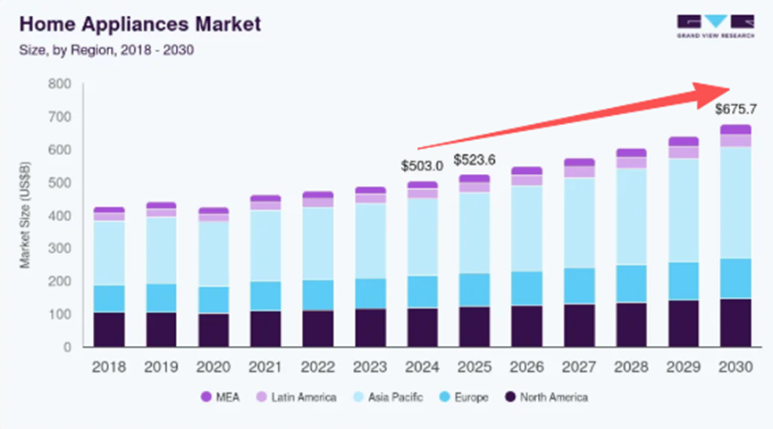 Grand View Research数据显示,随着可支配收入增加,城市化进程加快,全球家用电器市场正在持续扩容,2024年该市场规模约为5030.3亿美元,预计到2030年将达到6757.3亿美元,期间复合年增长率为5.2%。