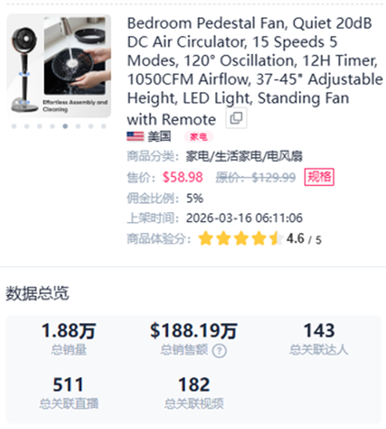 近期,在TikTok美区市场,中国品牌Sweetcrispy旗下一款落地扇销量就迎来爆发式增长。值得关注的是,该产品定价明显高于同类,在TikTok平台单价高达58.98美元(约合人民币402.94元),呈现出显著的高溢价特征。
