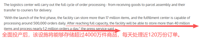 预计后期全面投产后,该物流中心面积能超过10万平方米,可存储商品总数将达到4000万件,日均可处理约120万订单,将大大提高Ozon在西西伯利亚区域的配送时效,提升整体服务体验。