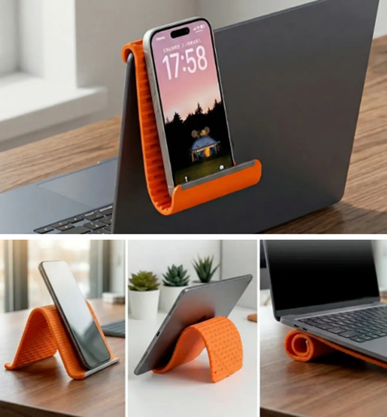 区别于市面上常见的固定式、卡扣式手机支架,它的使用方式自由度更高:产品主体采用硅胶和铝合金复合结构,兼具柔韧性和支撑性,可自由扭曲、定型。用户可以通过弯折出不同的弧度与角度,来牢牢固定、悬挂、抬高手机、平板、电脑等产品。