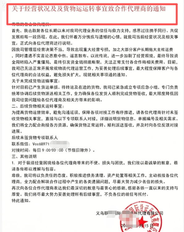 4月15日,义乌跃某国际货运代理有限公司发布一则官方公告《关于经营状况及后期货物运转事宜致合作代理商的通知》;