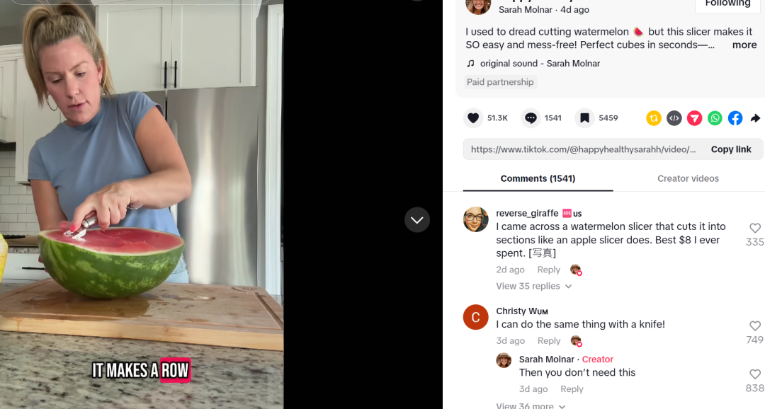 类似地,前段时间,一款“吃瓜神器”,2合1西瓜叉切片器也在TikTok掀起消费热潮。28天内卖了2.35万件,累计销售额达24.49万美元(约合179万人民币),直接冲进美区厨房类目销量榜前三。