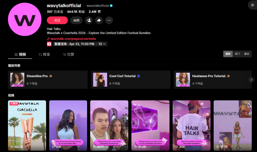 Wavytalk在营销上充分发挥了TikTok的流量优势,推行“内容驱动增长”策略。品牌官方账号已积累46.4万粉丝,获得230万点赞。通过与572名美妆类达人合作,发布超600条推广内容,形成多层次、高覆盖的传播矩阵。