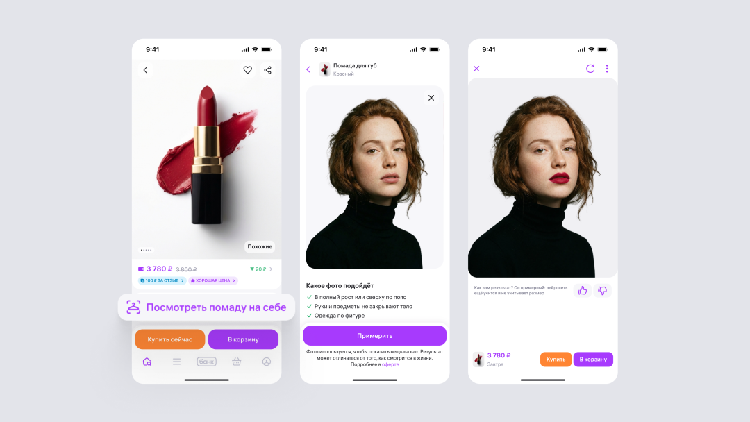 该工具可帮助用户在购买前预览产品上脸效果。用户可以在自己的照片上试用口红或唇彩颜色:只需点击商品卡片中的专用按钮并上传人脸照片,系统便会自动应用所选色号。算法会综合考虑肤色、光线及色彩表现,从而呈现更真实的视觉效果。