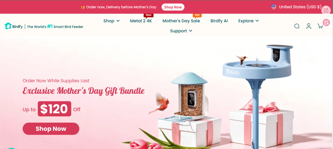 进入官网,首页banner打的是母亲节促销活动,最上方挂着最高优惠120美金的字眼,直接刺激下单。同时设有Blog栏目,定期发布鸟类知识科普;News栏目更新品牌动态,如产品获奖、公益活动等。