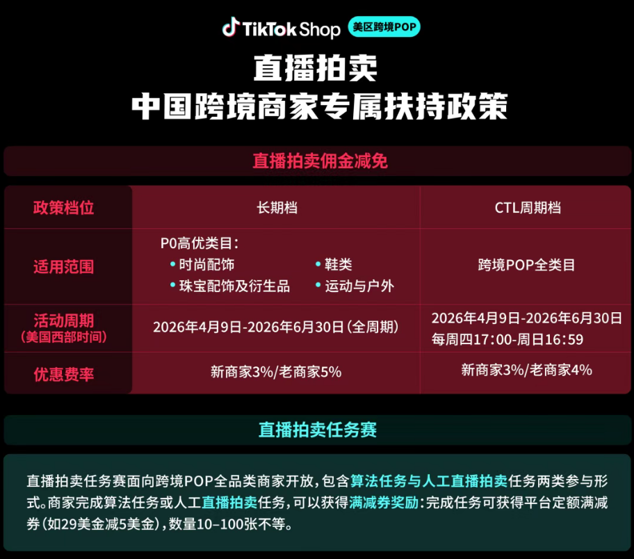 2026 年 4 月 29 日,TikTok Shop 正式释放重磅消息,面向中国跨境商家开放美区直播拍卖功能招商。伴随着美国直播电商市场快速升温,直播拍卖模式凭借高互动、高溢价、高转化的特点,成为当下增速最猛、红利最足的新赛道,不少提前入局的商家已经迎来订单与 GMV 的双重爆发。