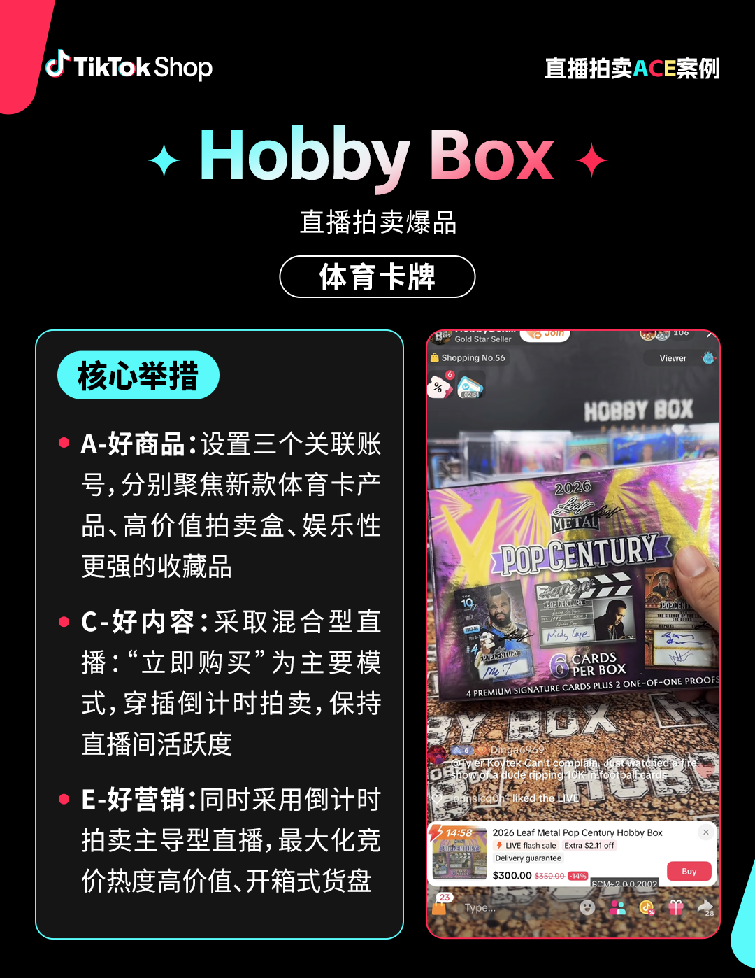 Hobby Box:以新款卡、高价值拍卖盒、娱乐性收藏品为主的体育卡牌,直接购买、倒计时拍卖混合直播,2个月内直播GMV达300万美金
