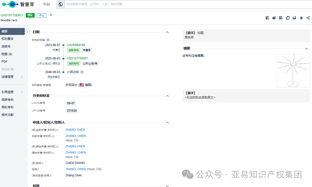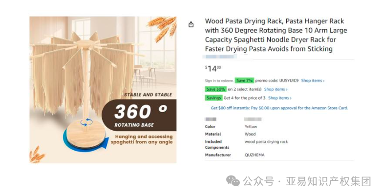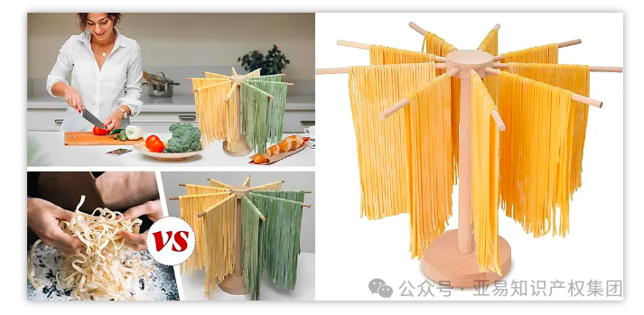 本案原告是一家国人企业,长期专注于木工工具的设计、制造及销售业务,其核心产品面条架由木材制成,配有旋转面条烘干机支架,可方便用户取用和有效干燥,同时防止面食粘在一起,还能有效节省空间,便于收纳,适合各种面条制作,包括意大利面条和意大利宽面条。
