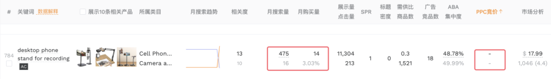 相对大词,再看desktop phone stand for recording这些词,可以发现其特点是搜索量有限,每个月可能几百次次曝光,但好处是竞争少,CPC能低到只有大词的三分之一甚至没有推荐CPC值。更重要的是,这些词的用户往往需求更精准,购买意图更强。比如粉色女生手机支架这个词,虽然搜索的人不多,但能搜这个词的用户,已经把颜色、对象都想清楚了,下单的概率反而更高。