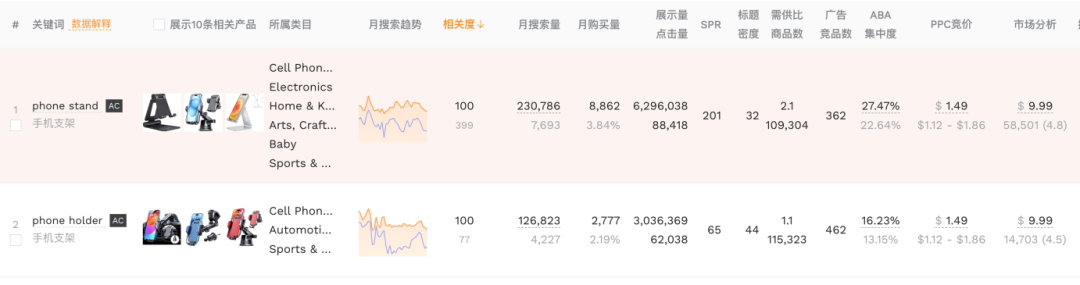 可以看到phone stand,phone holder这类大词越搜索量有十几万甚至二十几万,但是CPC竞价也要到1.5美金,相对售价9.99美金,这个市场竞争是非常激烈了,如果不是Top产品基本,亏损的概率是极大的。