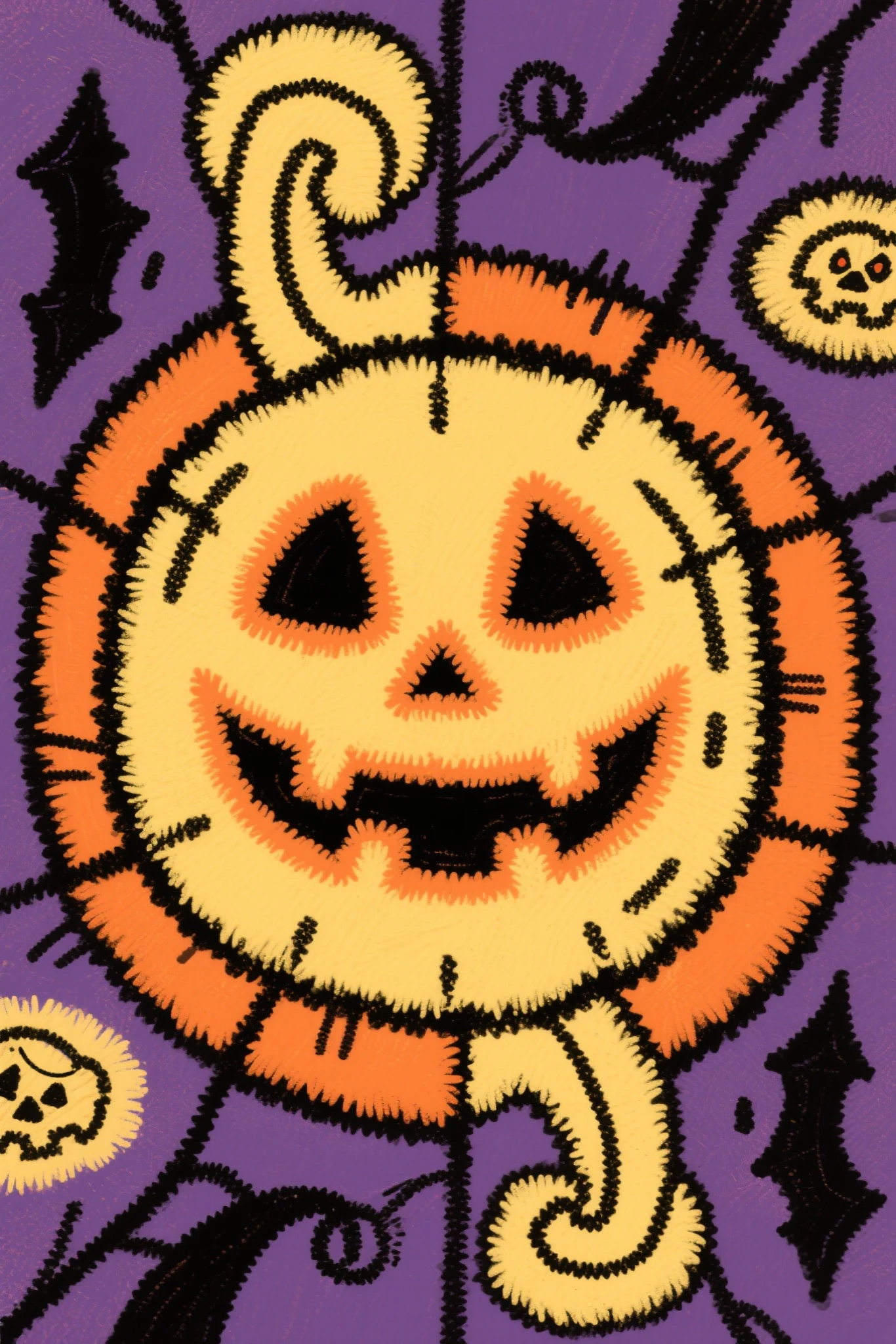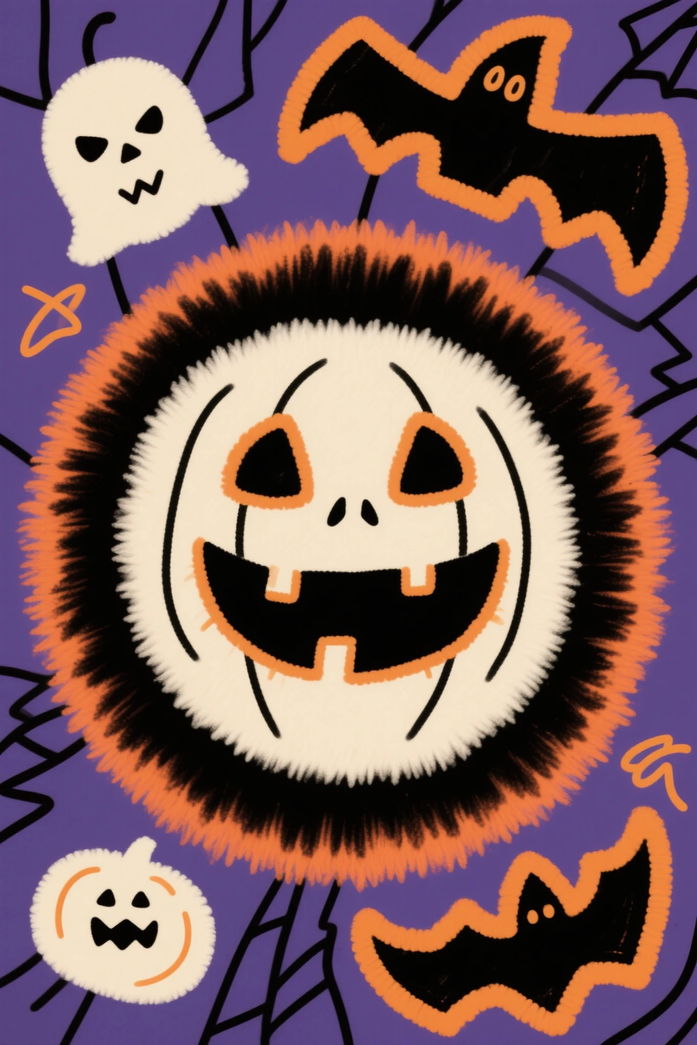 - 经典符号现代化:将南瓜灯、骷髅、蝙蝠等传统元素与渐变色彩、抽象线条结合,打造复古蒸汽波风格。例如,Etsy 上一款 “复古南瓜与幽灵刺绣毛毯” 通过做旧色调和细腻针法,营造出神秘的万圣节氛围。
