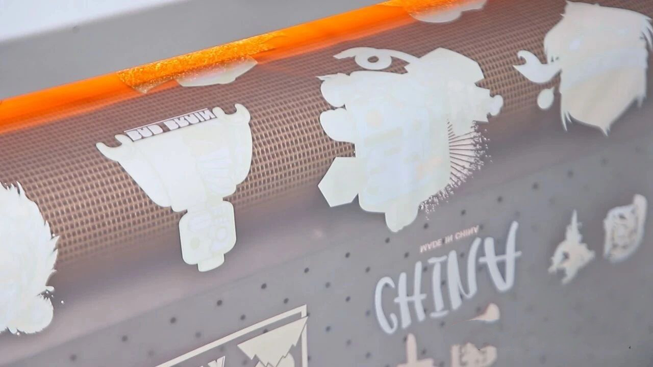 技术原理:通过数码喷印设备,在透明转印膜上先喷印一层彩色图案层作为底色,再覆盖白墨层。烫印时,通过高温高压将图案转印到织物(如T恤、卫衣、帆布包等)上。