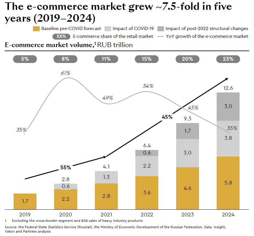 近五年来,俄罗斯电商市场经历了快速增长。据《俄罗斯电子商务发展报告》显示,2019至2024年间,俄罗斯电商市场规模从1.7万亿卢布增长至12.6万亿卢布(约1520亿美元),实现约7.5倍的跨越式增长。
