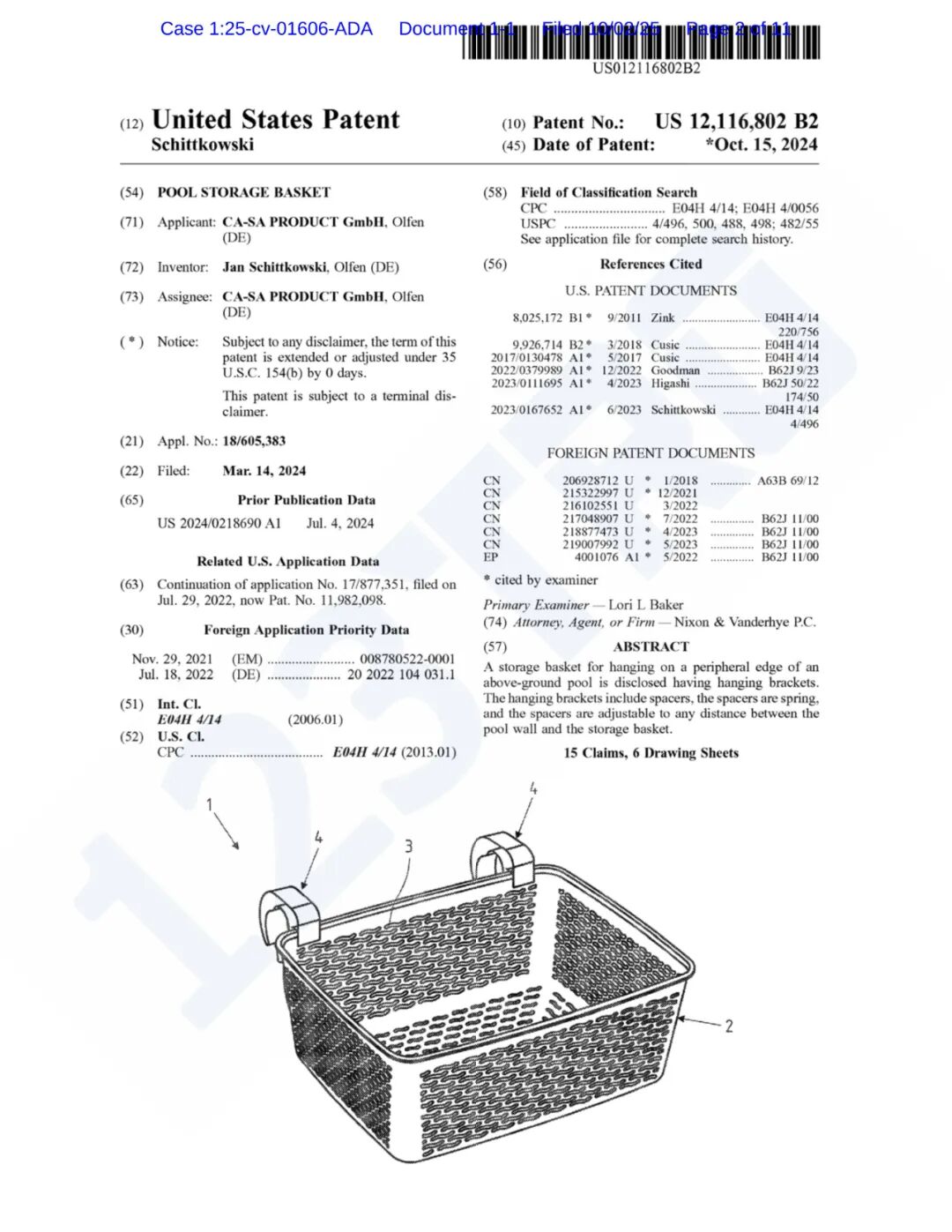 原告Ca-Sa Product GmbH和Carrie Box Pool Supplies Inc是控股与业务授权关系涉案专利的发明人Jan Schittkowski已经将专利全部权利转让给原告。原告曾在10月7日提出TRO,但被法官驳回,目前案件仍在审理中。原告:Ca-Sa Product GmbH、Carrie Box Pool Supplies Inc涉案专利US 12,116,802 B2属于发明专利,其核心保护范围: