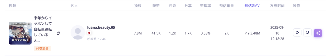 TikTok上,日本博主luana.beauty.05(@luana.beauty.05)拍的“骑行Vlog”视频,配上这款眼镜的BGM,播放量轻松过780万,带动销量2000+件!
