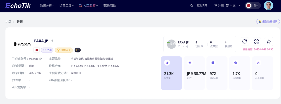 据Echotik后台数据显示,这款爆品来自于一家名叫PAXA JP(@paxajp)的跨境日本TikTok小店,自2个月前上架产品以来,共计售出这款爆品1.57万件!