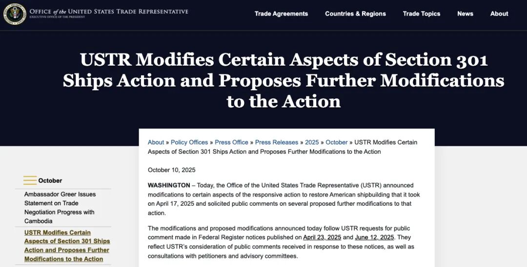 当地时间 2025 年 10 月 10 日,美国贸易代表办公室(USTR)发布公告,就“301条款”调查《针对中国在海事、物流和造船领域的主导行为》发布修改通知及拟议修改通知,特别涉及对中国港口设备加征额外关税。