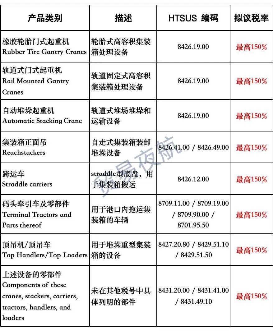 美国贸易代表办公室(USTR)宣布对特定中国制造的港口设备征收高额关税,作为Section 301行动的一部分,具体如下: