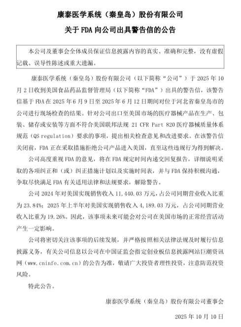 全球定制网最新获悉,跨境电商医疗用品大卖康泰医学发布公告称,2025年10月2日收到美国食品药品监督管理局(FDA)出具的警告信。