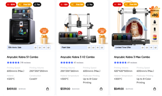 在出海渠道布局上,Anycubic采取“独立站+第三方电商平台”结合模式,入驻亚马逊、eBay、速卖通、Lazada等平台,售卖全系列3D打印机及其配件材料。其anycubic i3 mega上线后,首月销量从50台飙升至3000台,成为亚马逊畅销产品,多款产品长期稳居Best Seller。
