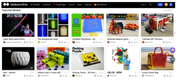 在品牌网站上,搭建“makeronline”模块入口,支持3D打印爱好者、DIY爱好者、创意玩家等用户上传个人创意作品,新用户也可在该平台上下载作品,获取创作灵感,帮助新老用户交流3D打印,进一步维护用户与品牌之间的黏性与忠诚度,提高品牌复购率与口碑。