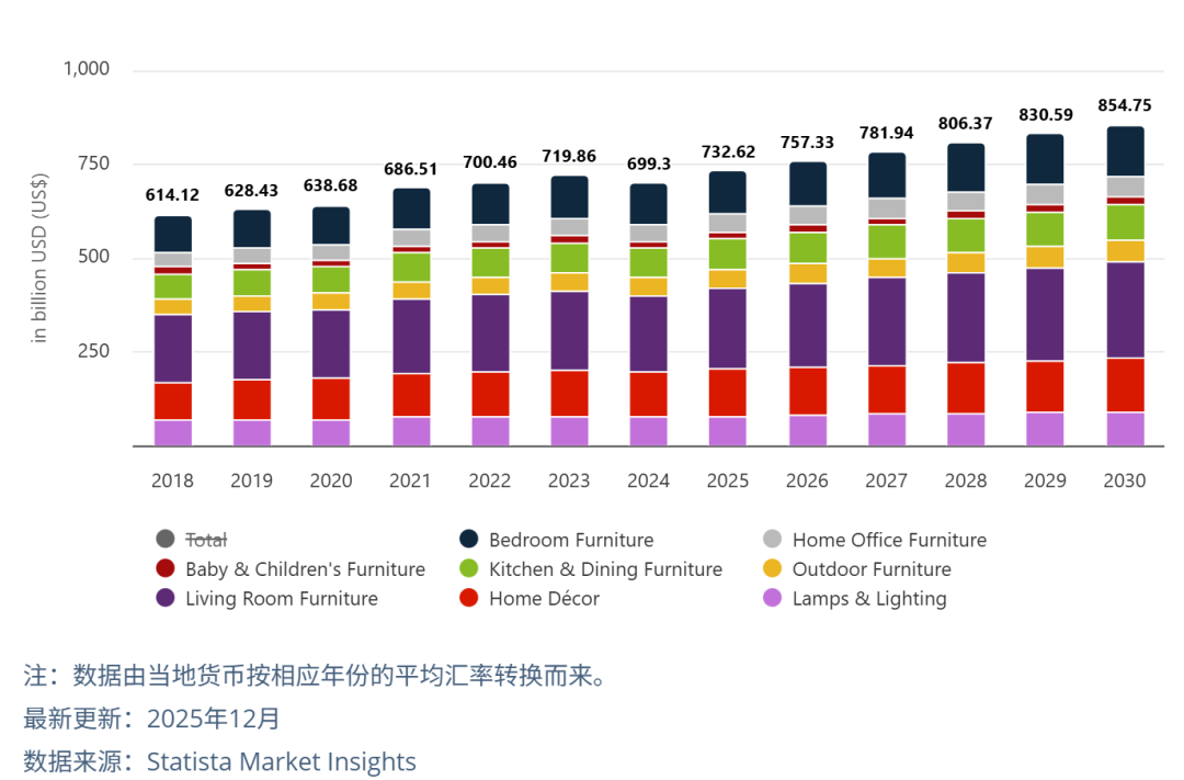 据Statista预测,2026年全球家具市场总收入预计将突破7573亿美元,并保持稳健增长。其中,美国市场以超过 2655亿美元的预期收入继续领跑,德国、法国、英国等欧洲市场也展现出巨大的增长潜力。在这块千亿美元的大蛋糕中,客厅家具(如沙发、边桌、电视柜等)独占2234亿美元份额,不仅是市场的大头,更是卖家切入欧美家居生态的“核心流量入口”。